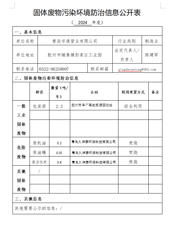 2024年度固体废物污染环境防治信息公开表
